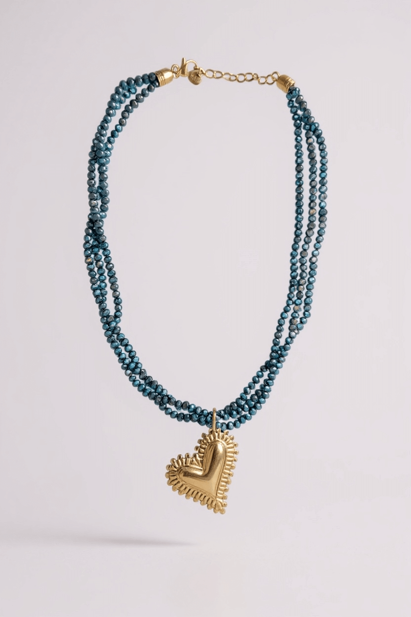 Colar Perola Azul Coracao Dourado