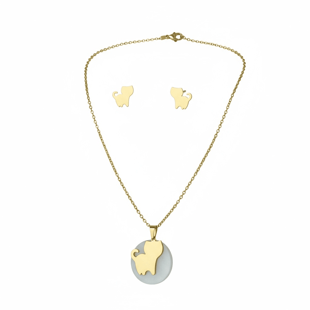 Conjunto Colar e Brincos em Aço Dourado – Tema Gato