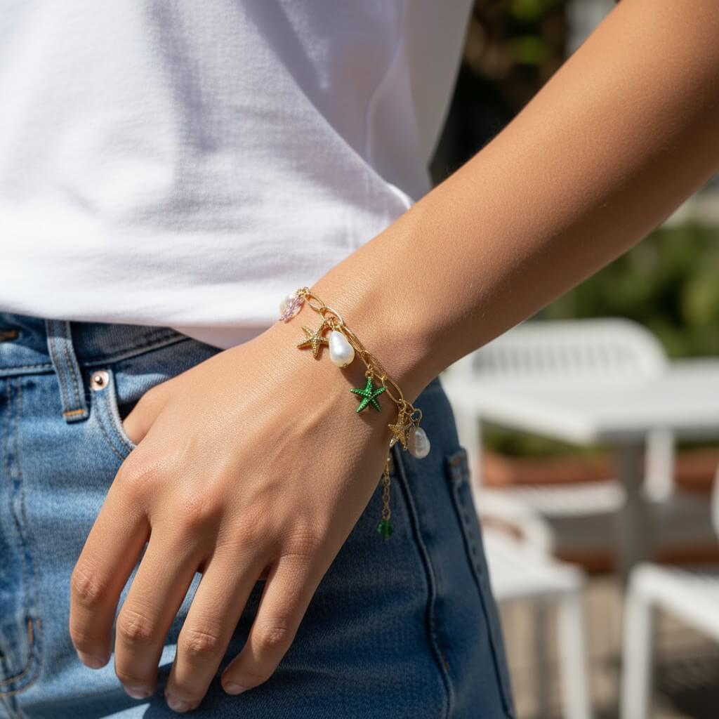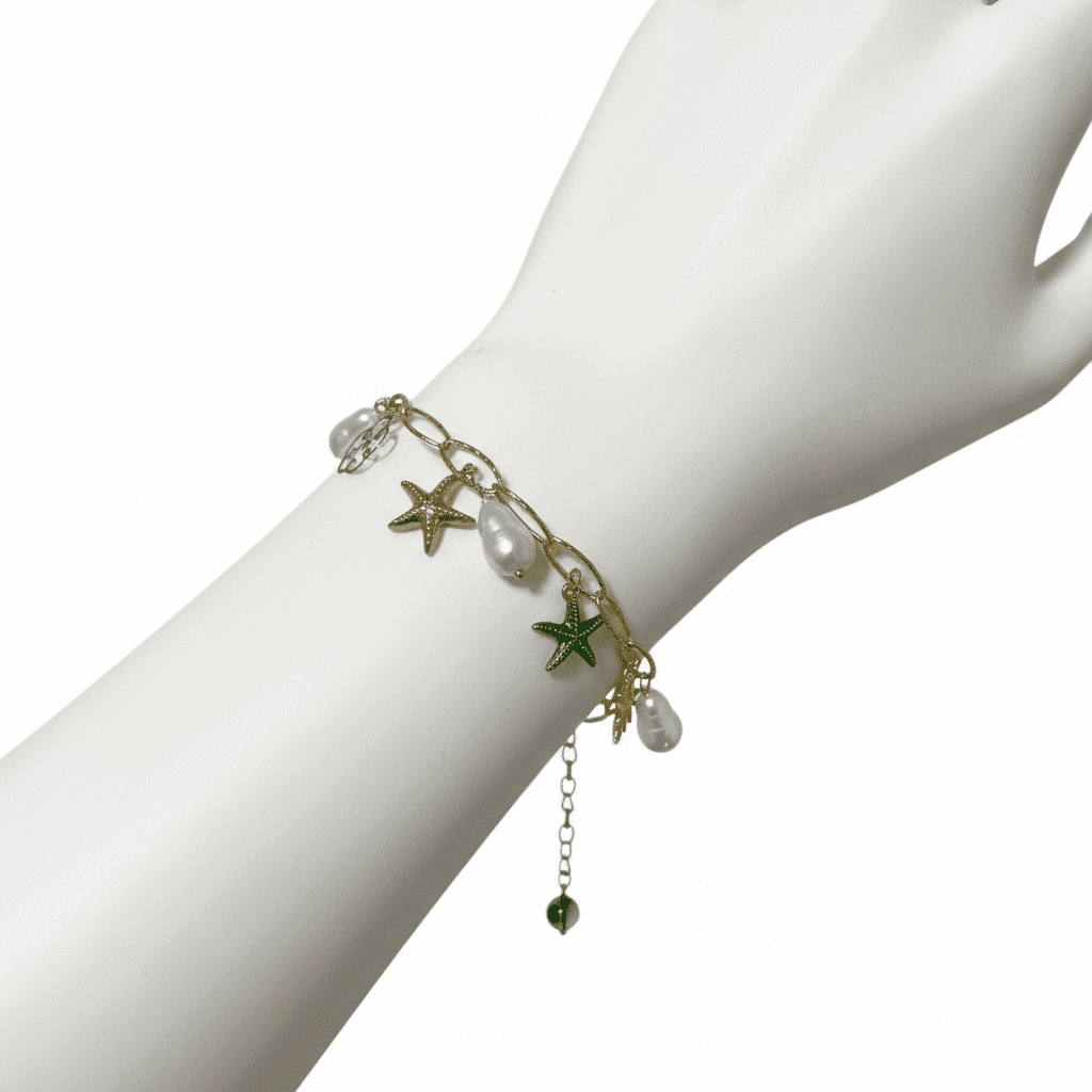 Pulseira Dourada Charm com Estrelas-do-Mar e Pérolas Irregulares