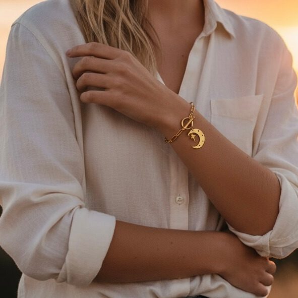 Pulseira Dourada com Pingente de Lua e Estrela